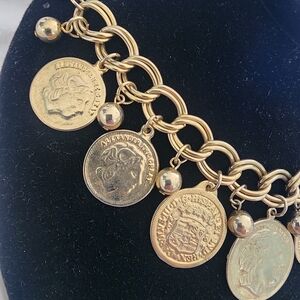 This vintage gold tone coin bracelet adds a touch of elegance to any ensemble. Featuring detailed coin charms on a gold chain, it's perfect for any occasion.