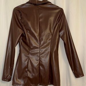 Elevate your style with this chic brown faux leather jacket. Perfect for any occasion, it offers a sleek and modern look.