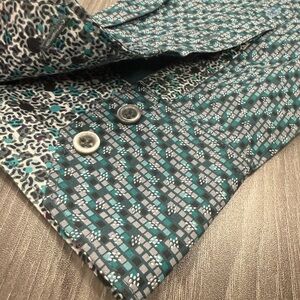 Stylish green and gray squared geometric pattern. Comfortable fit. Ideal for business or casual outings. Measurements are approximate. Please look at all photos carefully. Shirt from a non-smoking home. It is brand new without tags.