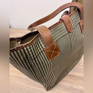 Vintage Polo Ralph Lauren Large Canvas Leather Tote Bag Plaid Houndstooth Brown