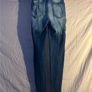 Chic distressed straight leg jeans. Dark blue hue. Ideal for everyday wear.