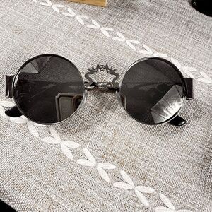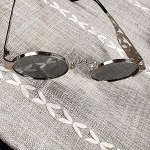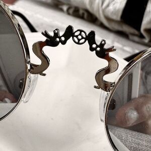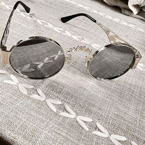 Stylish silver sunglasses with intricate detailing and black accents. Perfect for adding a touch of elegance to any outfit.