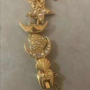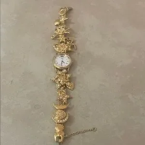 Elegant gold charm bracelet watch perfect for adding a touch of luxury to any outfit. Features intricate charm details and a classic watch face.