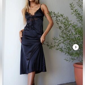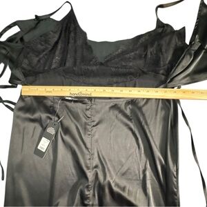 Bust is very adjustable with the ties . Sexy and soft with satin finish . MIDI length . Sold out everywhere . Great sexy little black dress for Valentine’s Day!