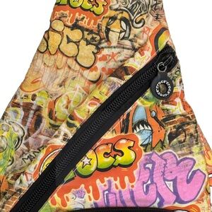 Crocs Graffiti Sling Backpack vintage-style crossbody bag known for its vibrant, multi-colored graffiti print
