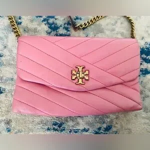 Authentic Tory Burch quilted leather crossbody in a soft pink color with gold-tone chain and logo hardware. Classic, feminine style that works for everyday wear or dressing up.