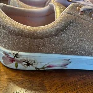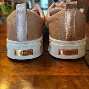 Ted Baker Stylish sparkly peach sneakers with floral detail on the sole. Perfect for casual outings. Great condition. I only wore them twice because they are too big. I ordered the wrong size.