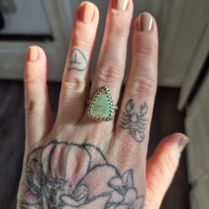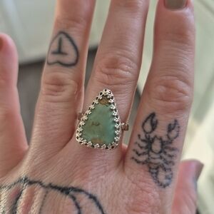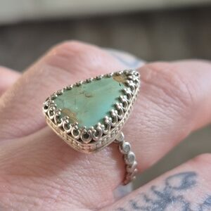 Elegant handmade sterling silver ring featuring a stunning triangular genuine turquoise stone. Handmade by NB artist Sister Sun Jewelry. There is a small crack in the stone. Perfect for adding a pop of color to any outfit. Size 7. www.sistersunjewelry.com