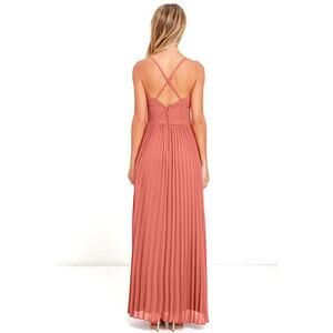 Elegant chiffon, in a rich terra cotta hue, shapes a triangle bodice and sultry V neckline supported by crisscrossing, adjustable spaghetti straps. The fitted, pintucked waistline accentuates your figure before flowing into an accordion pleated maxi skirt. Hidden back zipper and clasp.