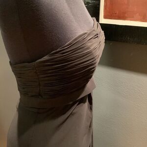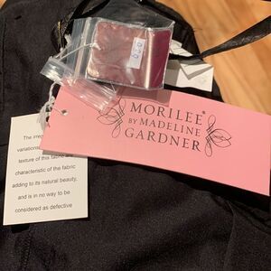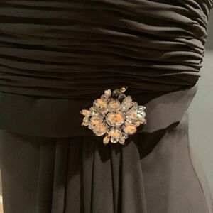 Morilee black gathered bodice crystal broach chiffon maxi, NWT, size 4. Bodice sideseam boning. Optional spaghetti bodice straps included. Nonsmoking home.