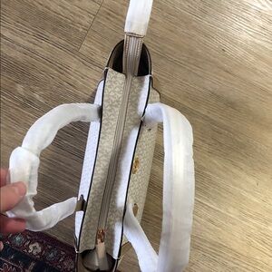 Stylish Michael Kors tote with cream body and gold accents. Perfect for everyday use and travel . Zipper closing , extra inside compartment. MK logos allover . It’s in original packaging never used brand new , it’s nice large size . No returns.