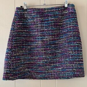 The product is a women's tweed multicolor metallic skirt by Ann Taylor Loft in size 6. It features a zipper closure, making it suitable for various occasions such as parties, casual wear, workwear, and business settings. The skirt is made of polyester and other fibers, with a tweed fabric type, and has a preppy style. It is lined and designed as a mini length skirt, perfect for the winter, fall, and spring seasons. Made in Vietnam, this skirt adds a touch of elegance to any outfit with its multicolor metallic tweed design.