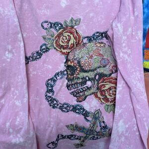 Long sleeve pink Kavio brand featuring skull, cross, roses and chains. Size Large but fits smaller