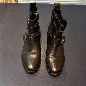 Sleek black leather ankle boots. Features buckle and zipper details. Perfect for versatile styling. 1 3/4 heel