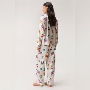 Embrace the spirit of the Wild West with this charming satin pyjama set from NastyGal. The eye-catching print showcases a delightful array of Western-inspired motifs, including colourful cacti, lucky horseshoes, and iconic cowboy hats. Perfect for those who want to add a touch of whimsy to their nightwear collection. The long-sleeved shirt with its classic notched collar pairs beautifully with the relaxed-fit trousers, ensuring both style and comfort as you drift off to sleep. Ideal for cosy nights in, lazy weekend mornings, or even as a quirky base layer for festival season. Style with fluffy slippers for the ultimate bedtime ensemble, or throw on the shirt with your favourite jeans for an unexpected daytime look that's sure to turn heads.