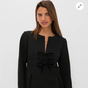 Chic black dress with long sleeves. Features stylish front ties. Perfect for versatile wear.