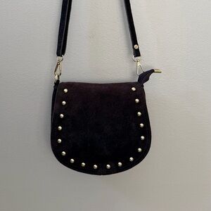 NWT, PERSAMAN New York, Elvira Chocolate Brown and Gold Tone Studded Suede Crossbody Shoulder Strap Bag, Purse, Made in Italy