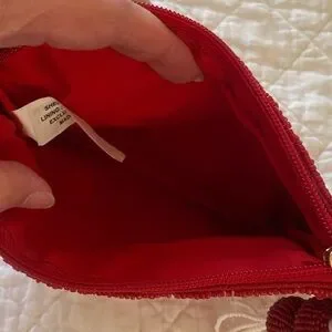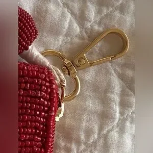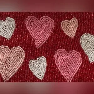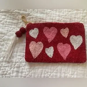 Red beaded clutch with beaded hearts in shades of pink & white on front & back. Zipped closure with beaded tassel. Gold colored clip. Can clip on belt loops for hands free carry or clip to larger bag. Or add keys. Excellent new condition has never been used. Inside clean & colored red. Perfect for that Valentines date or any outing. Handmade in India. Measures 7.5” X 5”.