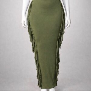 Stylish olive green skirt with fringe detailing. Perfect for a chic and trendy look.