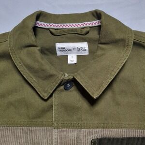 Discover a unique layering piece with this OUIGI THEODORE for SUN STONE jacket. This distinctive outerwear showcases a thoughtful patchwork design, blending textures and tones for a sophisticated yet rugged aesthetic. The rich olive green hue corduroy and contrasting brown denim panels create visual interest, while the classic button-front closure and pointed collar offer timeless appeal. Multiple pockets provide practical storage without compromising the jacket's streamlined silhouette. Perfect for casual outings or adding a touch of elevated style to your everyday look.