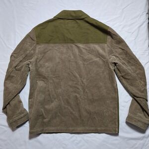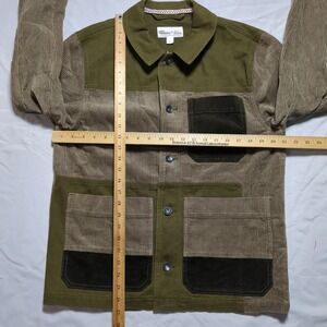 Keywords: patchwork jacket, corduroy, olive green, button front, pointed collar, menswear, designer, utility jacket, textured, fall fashion, spring fashion, casual wear, streetwear