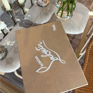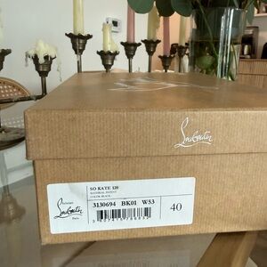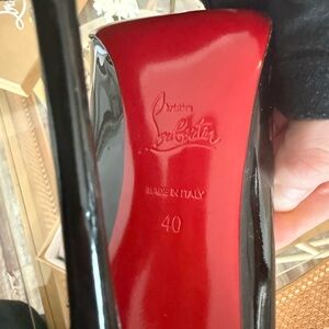 Sleek and patent leather black heels. Signature red sole. Basically new, worn 2 times. Comes with a letter inside you can fill out for a gift. Heigh is 120, size EU 30.