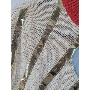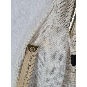 Preowned sweater with soft knit and intact appliqué and metallic trim. Multiple small tan stains and age spots on front hem, shoulder, and body, plus scattered discoloration on back. No holes, snags, or missing embellishments.