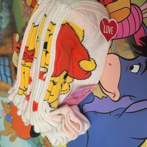NWT Vibrant Disney gift bags with Winnie the Pooh, Tigger, and Eeyore. Each one measures 20"x15"x6".& 9 NWT Winnie socks...Ideal for celebrations.