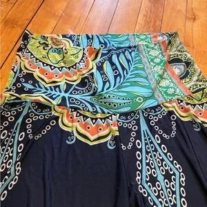 Step into ultimate comfort with these stunning high-waisted palazzo pants. Featuring an intricate, oversized mandala and botanical print in vibrant shades of teal, orange, and lime green over a deep navy base.