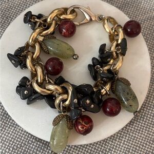 This stunning bracelet features a blend of gold and black tones, accented with red and green charms. Perfect for adding a touch of elegance to any outfit.