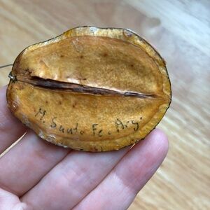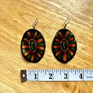 These large but very light earrings are hand painted on a large dried bean pod (see back of the earrings). They are signed by the artist on the back, and are coated in a light varnish on both sides. Bought in Argentina.