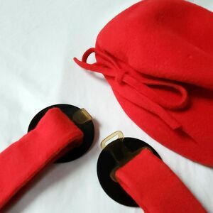 Vintage 1940s Red Wool Dress, Matching Hat, Rhinestone Belt, Women's Small
