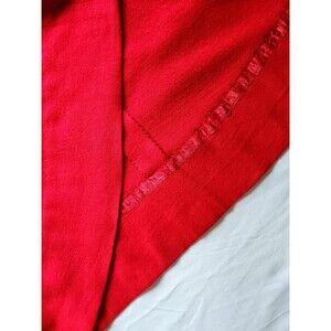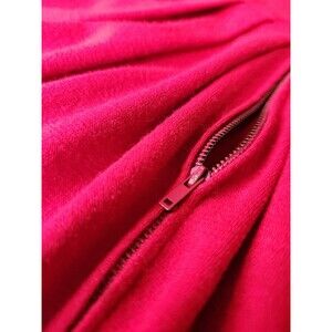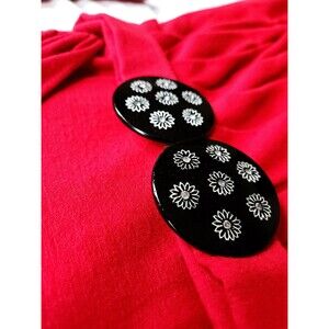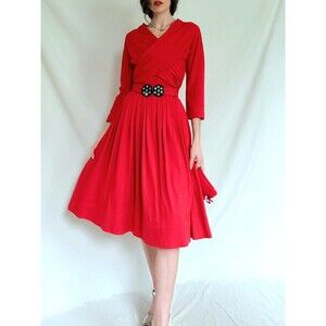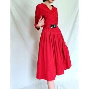 Beautifully handmade fit & flare midi in sturdy mid-weight, crimson red jersey wool with iconic gathered & draped cross-bodice design, 3/4 dolman sleeves, underarm gussets, fitted waist, perfectly knife-pleated skirt, pinked seams, petite brass Talon zipper, and a self-facing belt featuring rhinestone-encrusted flowers on a black & white circular buckle with a lucite clasp.