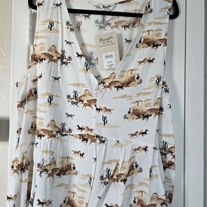 Wrangler Retro peplum top with a Western horse and cactus print. Pullover with a sleeveless design.