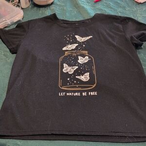 This stylish black t-shirt features a charming butterfly design, perfect for nature lovers. Comfortable and trendy, it's a great addition to any wardrobe. See picture for accurate size