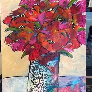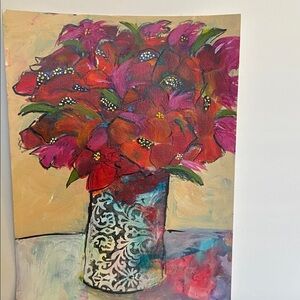 Colorful floral Acrylic painting featuring red and pink flowers in a decorative vase. Perfect for adding a splash of color to any room.