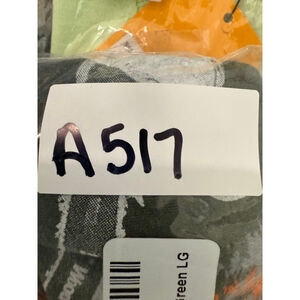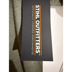 This new Stihl Outfitters men's "Like a Boss" graphic tee is olive green, size Large. The front features a forest scene with grey and orange trees, a chainsaw with "Stihl Wood Boss" text, and the phrase "LIKE A BOSS" with a wood log design for the 'O'. The shirt is composed of 60% cotton and 40% polyester, made in Honduras. It includes original hang tags, confirming its new condition, and is also pictured sealed in its packaging.
