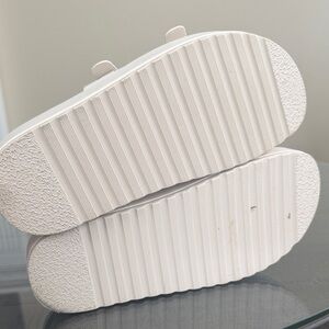 Stylish cream platform sandals with gold buckle accents. Perfect for casual outings.
