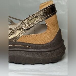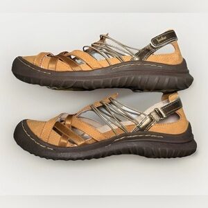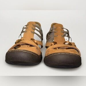 The Relax Foam Jambu Women's Chestnut Closed Toe Leather Sandals in brown tan, size 8, are designed for comfort and style. Featuring a solid pattern, hook & loop closure, and low heel height, these slip-on sandals are perfect for everyday wear. Made with leather lining, cushioned foam insole, and adjustable strap, these breathable sandals also have a rubber outsole for durability. With the Jambu brand reputation for quality and the Chestnut product line, these sandals offer a perfect blend of elegance and practicality for women on the go. Excellent condition.