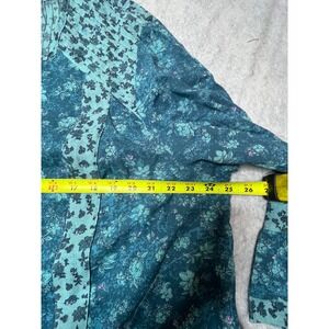 Discover effortless charm in this LOGO by Lori Goldstein tunic. A vibrant tapestry of teal and blue floral prints unfolds across the fabric, creating a visually captivating design. Paneled accents in a lighter teal echo the playful floral motif, leading to gracefully flared bell sleeves that add a touch of bohemian flair. The tiered ruffle hem creates a flattering silhouette, perfect for movement and adding a touch of feminine whimsy to your look. This versatile piece is ideal for a casual brunch, a relaxed day out, or a stylish vacation ensemble.