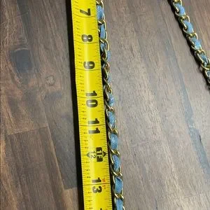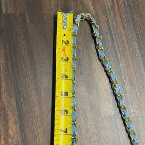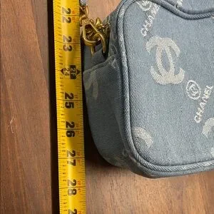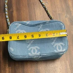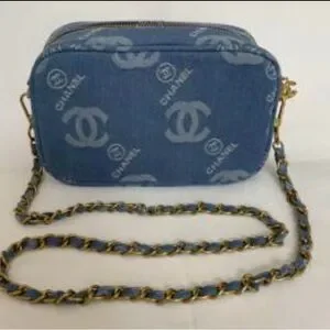 Stylish Chanel crossbody in denim blue. Has distressed look. Features iconic logo pattern. Ideal for versatile wear.