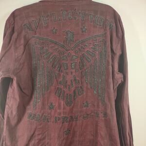 Perfect for casual outings or a night out, this shirt features a classic button-down design and the iconic Affliction aesthetic. The red and black color adds a touch of sophistication, making it a versatile addition to any wardrobe. Specialty detail of embroidery on back of shirt.