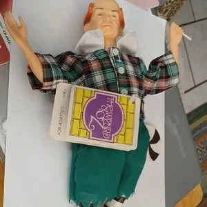 Colorful plaid doll with a lollipop. Features vibrant patterns and a playful design. lollipop boy. the wizard of Oz collection. this little guy lollipop stick broke i have the top. did not attempt to glue. decreased price in case a collector is interested