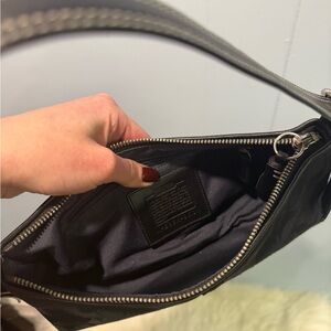 Y2K coach bag . Features a sleek design with a comfortable strap. Hamptons Signature East West Demi baguette shoulder bag in black canvas.