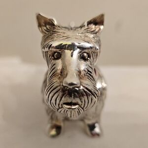 Charming silver Scottie dog figurines featuring a red and green plaid design. Perfect for collectors or as a decorative piece.