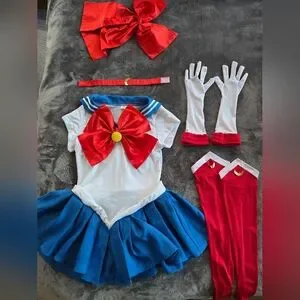 Sailor Moon Costume worn once for Halloween! This costume was good quality for what I originally bought for and I really liked it. Selling because I am going to wear another costume for Halloween. Comes with gloves, neck choker, and stockings. Some light red staining on gloves.