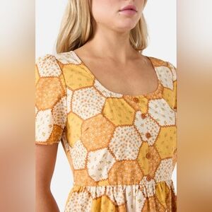 Say hello to cottagecore cuteness. The Patchwork Sleeved Mini Dress by Princess Highway features a vintage-inspired patchwork print with golden florals and hearts—like a love letter to simpler days. With a scooped neckline, faux button front, and gathered mini skirt, it’s sweet, nostalgic, and effortlessly wearable. Made from textured organic cotton, it’s soft, breathable, and charming from every angle.