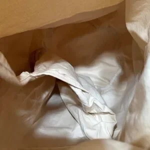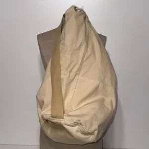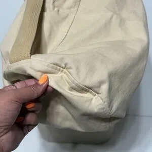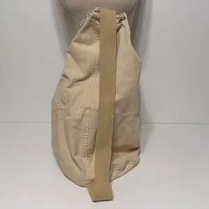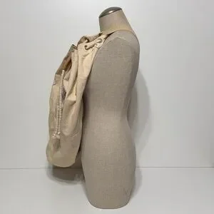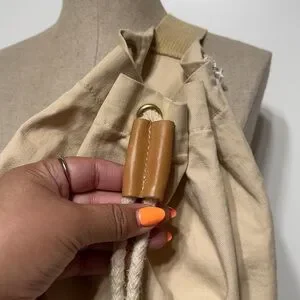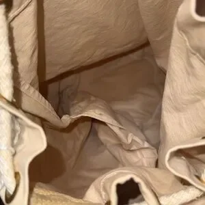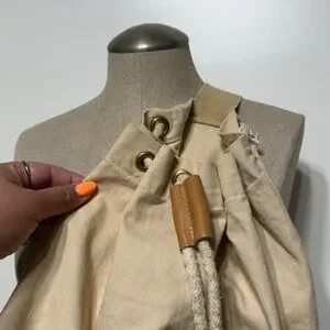 Thick rope drawstring closure with leather-like accents. Drawstring rope does show some unstitching- doesn’t affect function - please see picture 9
