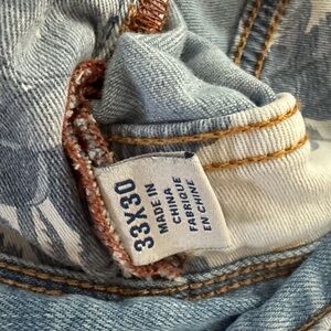 Classic Tommy Bahama relaxed soft blue denim. Features signature Tommy Bahama details inside and out to include stitching detail on back pockets, signature leather label and inside floral pockets lining. Minimal wear at back pockets as shown in pictures.