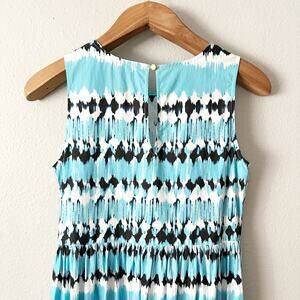 Light Aqua blue black and white abstract print sleeveless circle maxi dress with keyhole button back closure, unlined, pullover style